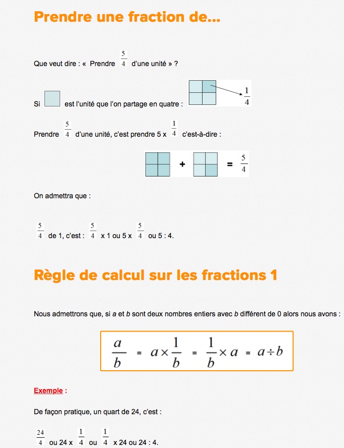 Un petit résumé sur les fractions qui facilitera l'apprentissage de la résolution d'équation du premier degré (ma fille est en 10e H ;-)... Repéré une petite erreur : Il est écrit: 5/4 de 1, c’est : 5/4 x 1 ou 5 x5/4 ou 5 : 4. Il faudrait plutôt écrire: 5/4 de 1, c’est : 5/4 x 1 ou 5 x1/4 ou 5 : 4 (...)