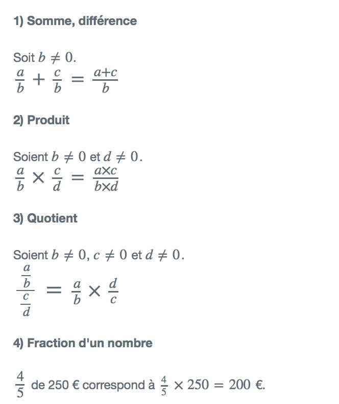 1) Somme, différence 2) Produit 3) Quotient 4) Fraction d'un nombre Source: http://www.lesbonsprofs.com