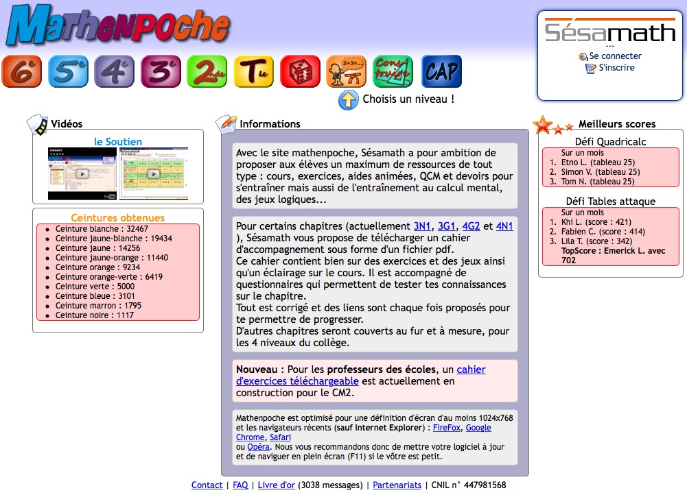 Avec le site mathenpoche, Sésamath a pour ambition de proposer aux élèves un maximum de ressources de tout type : cours, exercices, aides animées, QCM et devoirs pour s'entraîner mais aussi de l'entraînement au calcul mental, des jeux logiques...