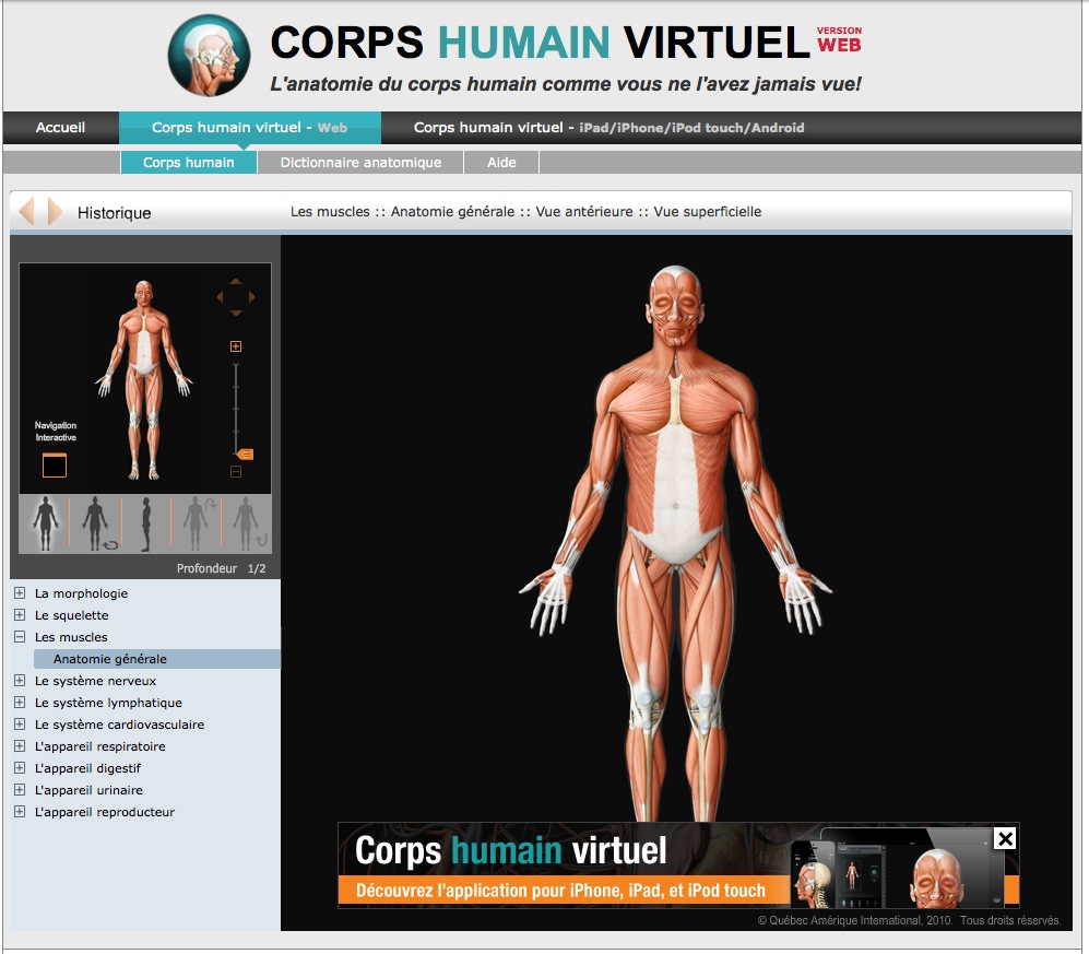 Cet atlas anatomique interactif permet d'explorer l'intérieur du corps humain grâce à un modèle 3D complet. Navigation facile à travers les différents systèmes et appareils qui sont clairement nommés et définis. Il est ainsi possible d'examiner l'anatomie humaine sous toutes ses coutures.