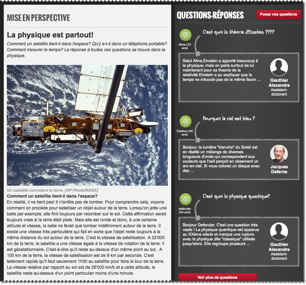 La physique est une science qui tente de comprendre et d'expliquer les phénomènes physiques du monde. Retrouvez dans ce dossier des vidéos de l'émission "L'oreille des kids", qui expliquent aux enfants comment les avions volent ou le fonctionnement de l'électricité statique. Regardez aussi cinq (...)