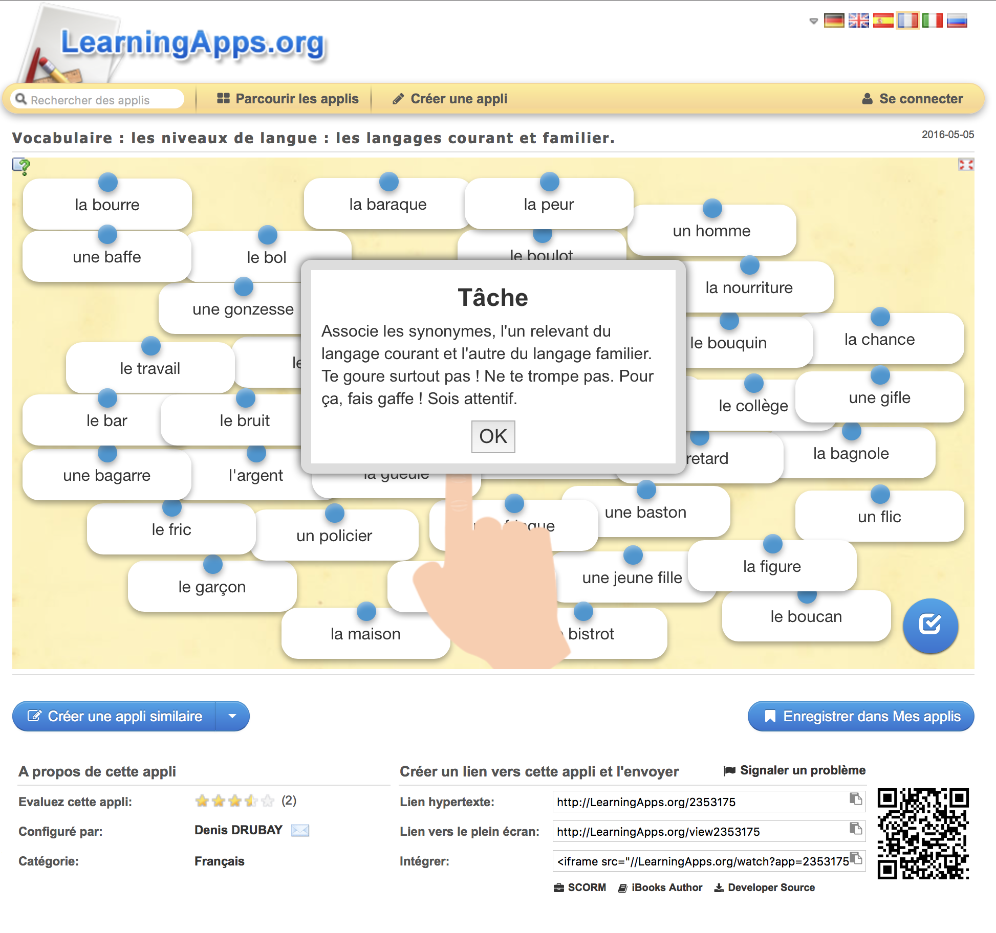 Voici un exercice pour entraîner les registres de langue en français (vocabulaire). Celui-ci traite plus spécifiquement du registre courant et du registre familier. Il y a des mots qui apparaissent à l'écran et le but est d'associer deux synonymes, l'un appartenant au registre familier et l'autre au (...)