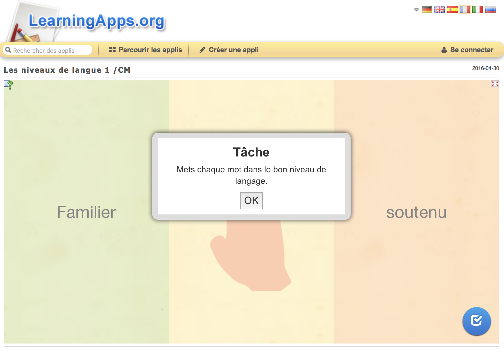 Voici un exercice pour entraîner les différents registres de langue en français (vocabulaire). Le principe est simple, il y a trois colonnes; familier, courant, soutenu et il faut classer les mots qui apparaissent à l'écran dans une de ces trois colonnes. L'ordinateur corrige tout seul. Cet exercice (...)