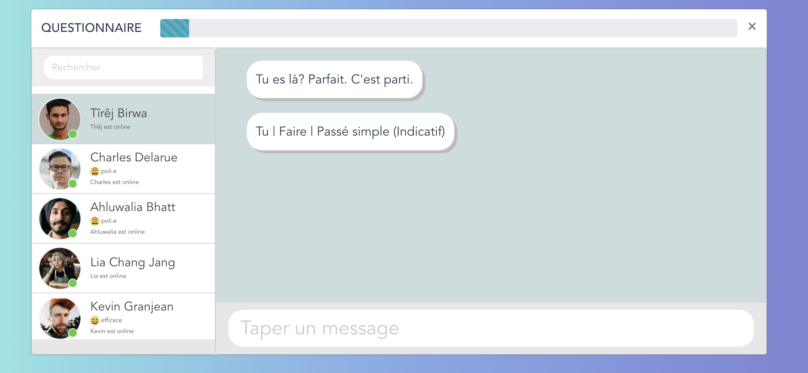 Bonjour à tous et à toutes , Mes élèves adorent s'entrainer avec ce site internet de défis qui imite une conversation Whatssap avec des personnages virtuels qui ont des personalités différentes ! Vous avez la possibilité de partager via un code des listes de verbes ou des temps spécifiques ! Gros (...)
