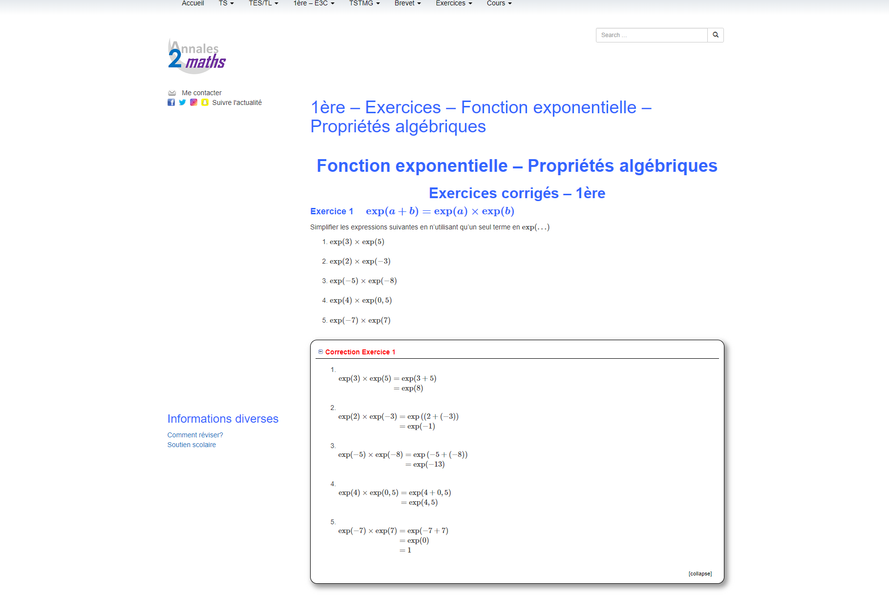 Vous trouverez sur ce site : Des cours en ligne Des exercices en ligne et surtout les corrigés des sujets de brevet et du baccalauréat de mathématiques (programme français) Une mine d'or !