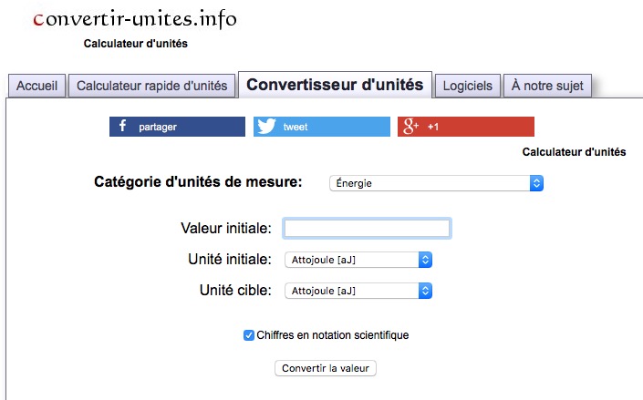 Ce lien donne accès à un convertisseur d'unités. Utilisation: Dans la rubrique "Catégorie d'unités de mesure”, on choisit la grandeur physique, puis on entre la valeur numérique sous “Valeur initiale”, on entre ensuite l' “Unité initiale” et l' "Unité cible”. Il suffit alors de cliquer sur (...)