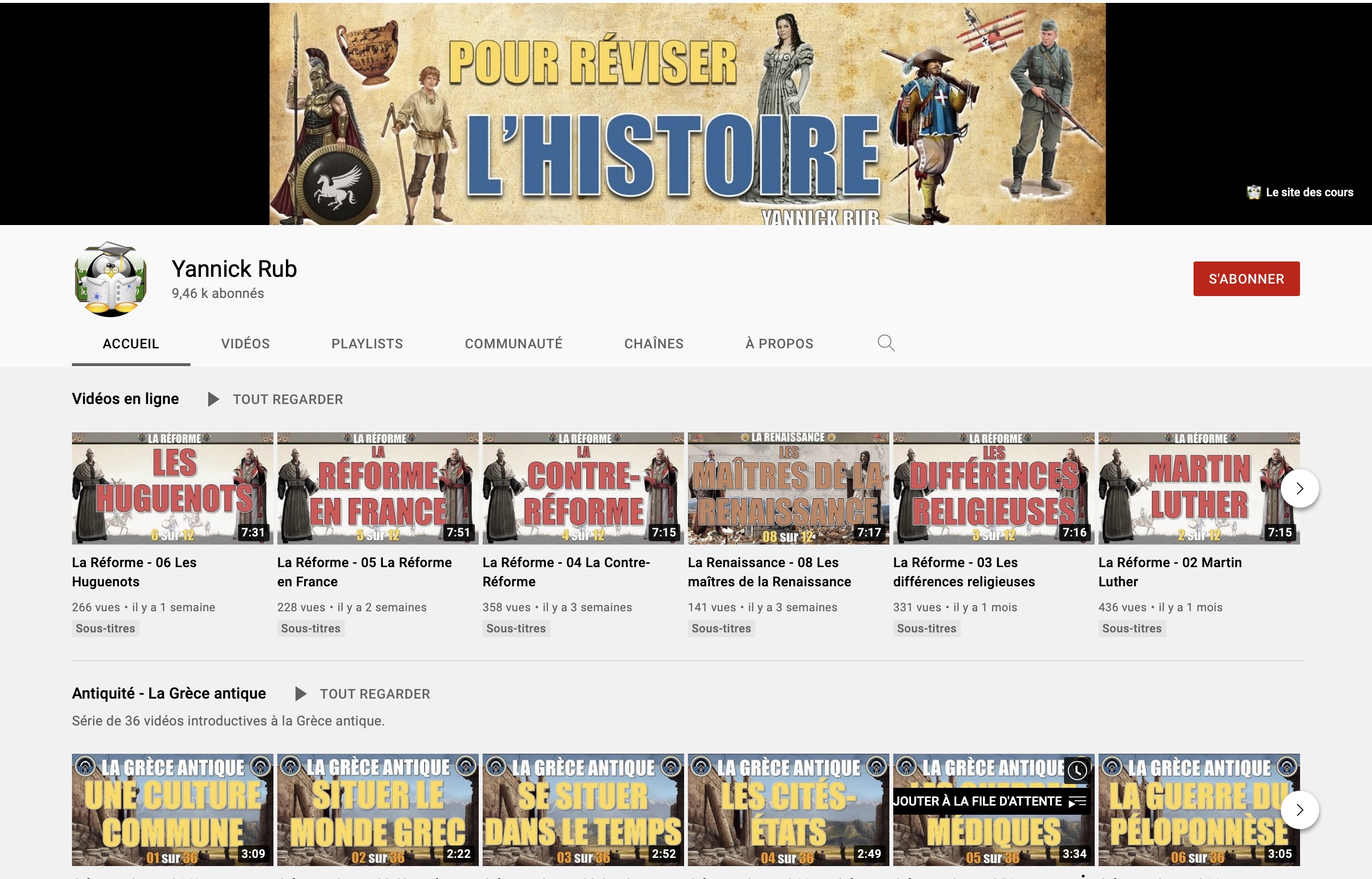 Super chaîne YouTube avec beaucoup de vidéos explicatives sur divers sujets de l'histoire. Bien fait, les vidéos sont classées par période historique ou grande thématique qui contiennent toutes plusieurs vidéos expliquant divers sujets. Je recommande! Le site des cours : http://www.profrub.com (...)