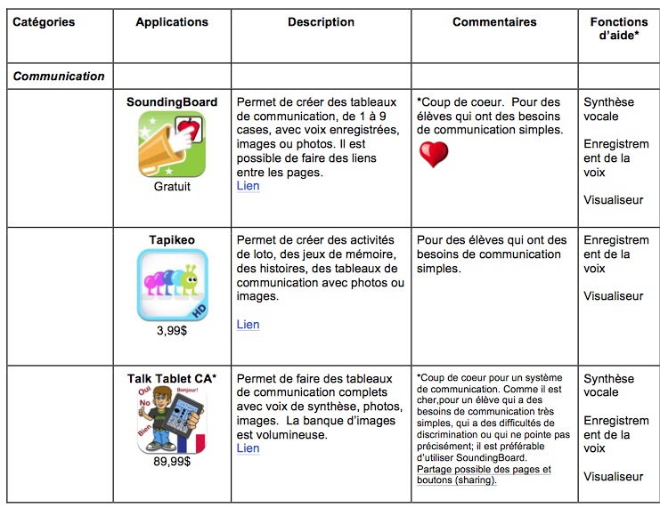 Tableau réalisé par une équipe de l'école Jean Piaget, au Canada, pour des enfants ayant des besoins particuliers ou en âge préscolaire. Comprends une colonne détaillant les fonctions d'aide.