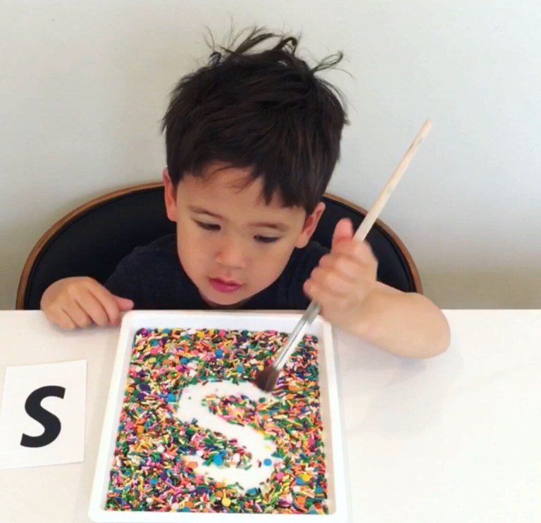 Matériel : un plateau ou couvercle de carton des petits grains ou "objets" ou du riz ( en utilisant du riz, je conseillerais de colorer le fond du plateau) un pinceau des lettres, chiffres, des formes modèles Un excellent moyen de rendre l'apprentissage des lettres, des formes et des chiffres (...)