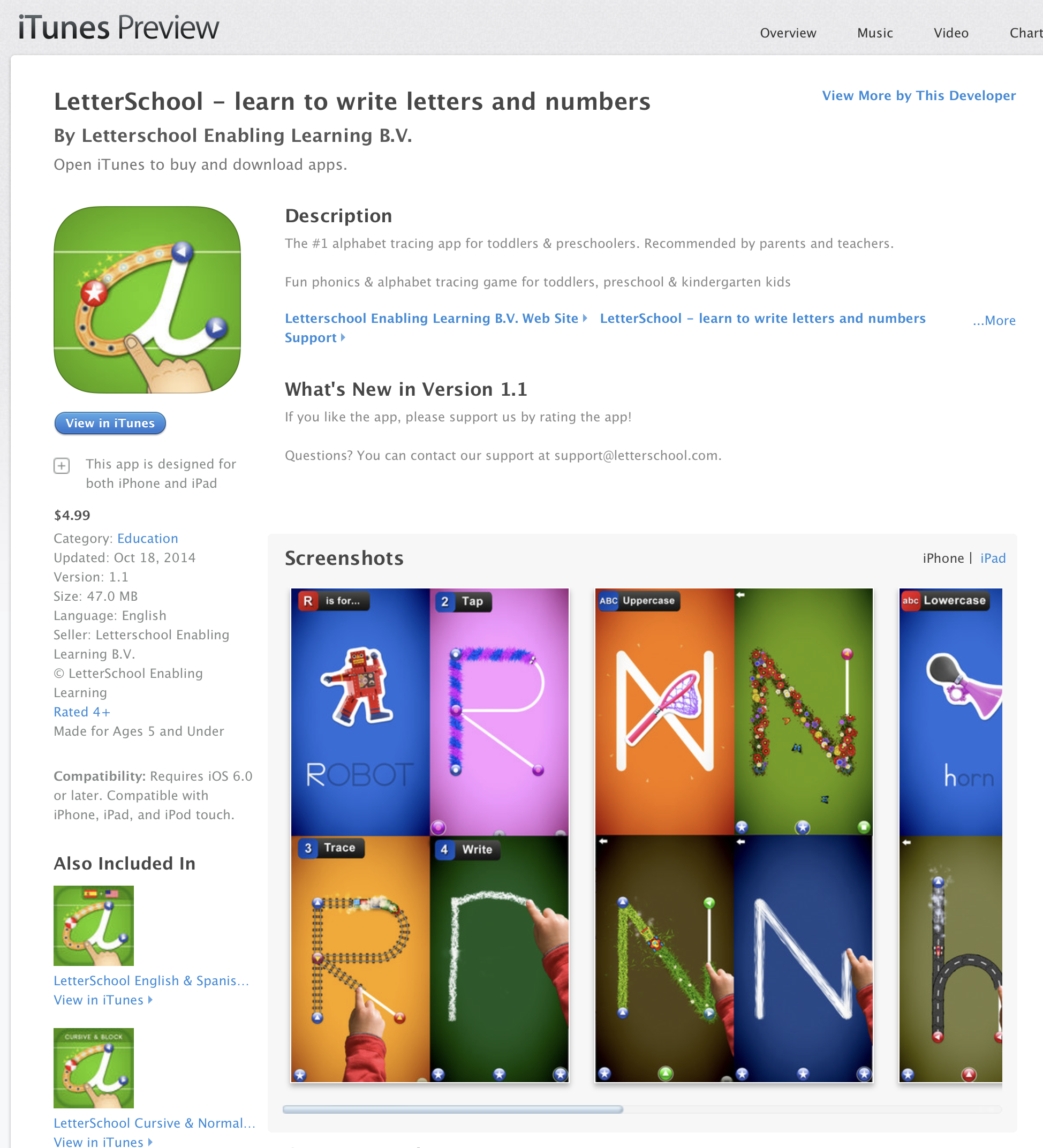 Jeu à télécharger sur iPad ou smartphone, malheureusement payant, mais cela en vaut la peine. Voici une démo sur Youtube, ce logiciel est idéal pour travailler la motricité fine et l'apprentissage de la caligraphie des lettres. https://www.youtube.com/watch?v=4sDZqBMqG-4