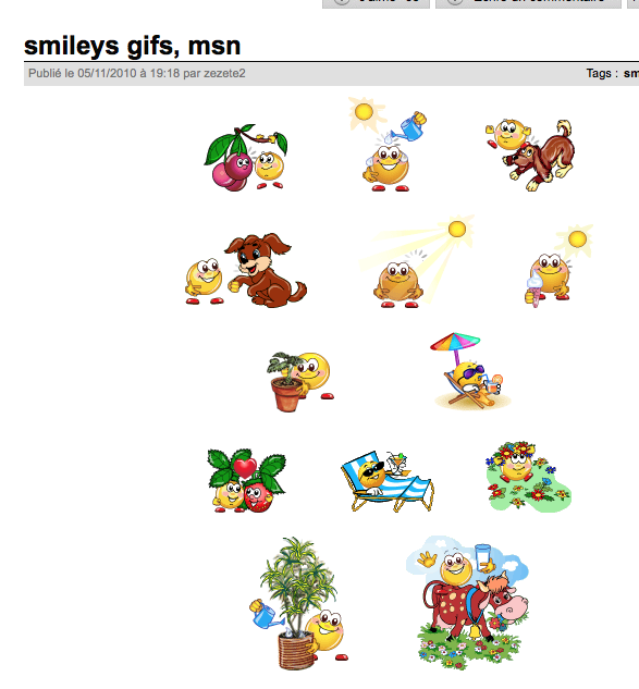 Smileys (GIF animés) de toutes sortes. Les thèmes annuels (Halloween, Noël, anniversaires, saisons, etc.) sont exploités