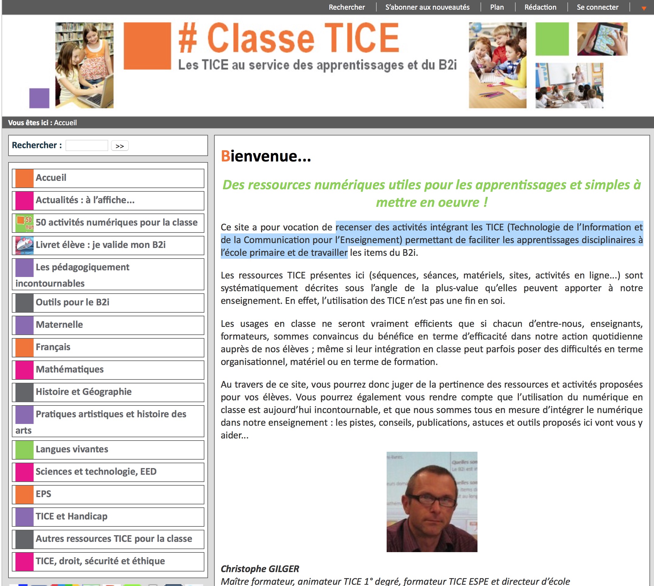 Inventaire d'activités intégrant les TICE (Technologie de l’Information et de la Communication pour l’Enseignement) permettant de faciliter les apprentissages disciplinaires à l’école primaire et de travailler les compétences MITIC. Site tenu par Christophe GILGER enseignant et formateur en Haute (...)