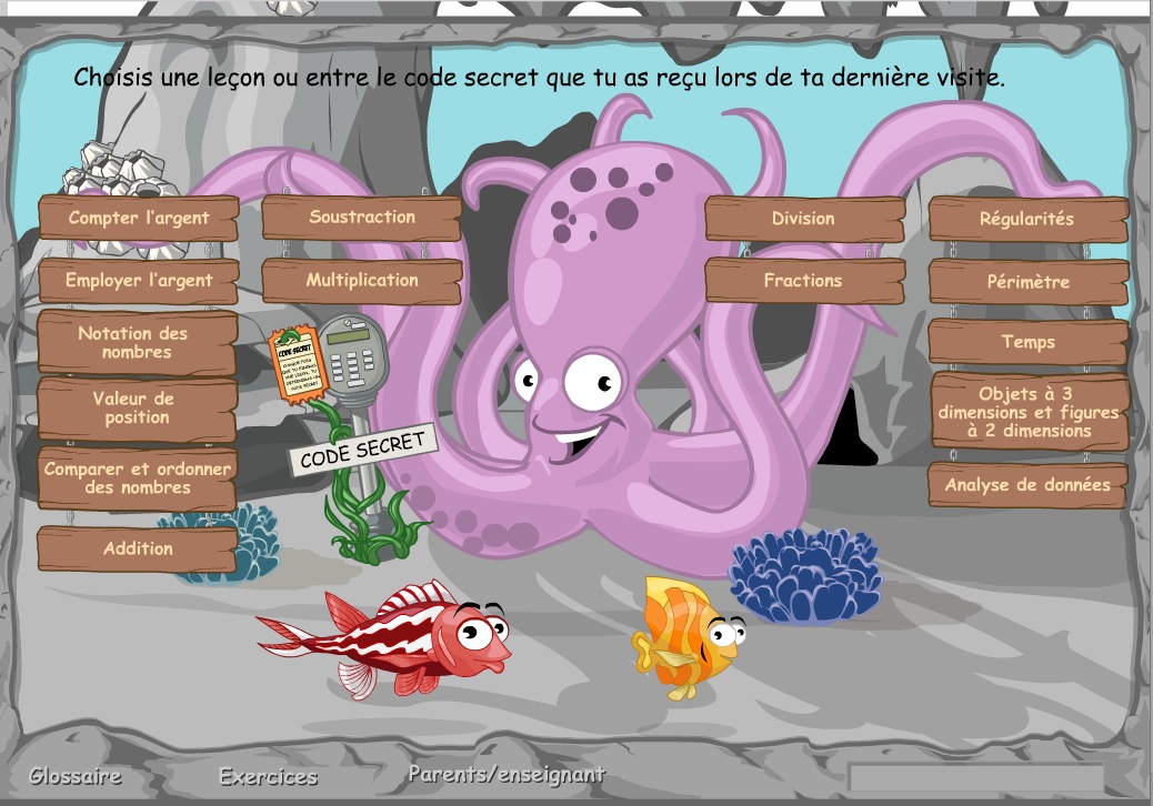 Aquamath 3, proposé par le gouvernement d'Alberta au Canada, est une plateforme où un gentil poisson, à qui vous pouvez donner un nom, va vous accompagner dans l'apprentissage des mathématiques.