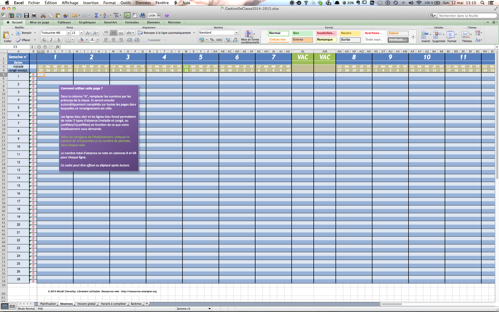 Classeur Excel (existe aussi en version Numbers pour Mac) reprenant différents éléments de gestion de classe : gestion des absences en 2 catégories planification annuelle horaire de la semaine programmes hebdomadaire générateur de notes (copie du document officiel de la DGEO) C'est la 3e publication (...)