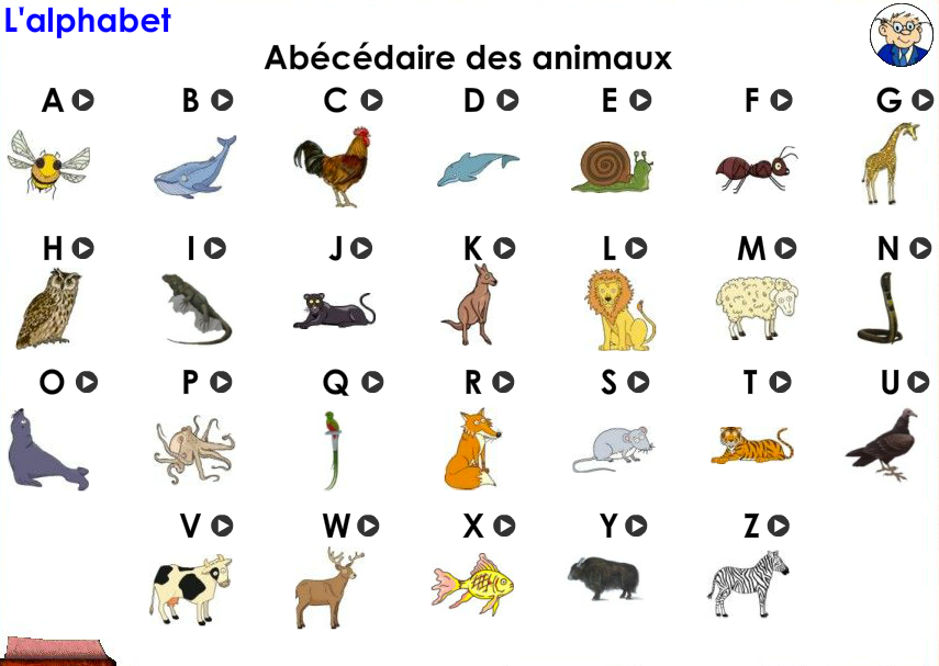 Toutes les lettres de l'alphabet illustrées avec des animaux. Le site propose également d'écouter les sons en lien.