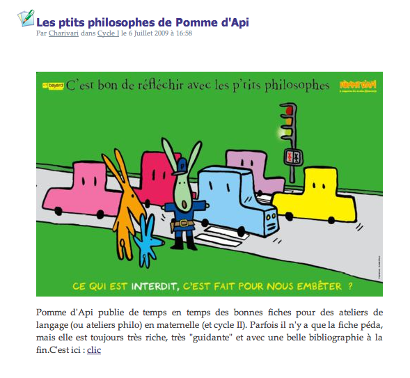 Site proposant du matériel (poster, fiche, images, méthode pour l'enseignant, etc) destiné aux premiers degrés et permettant de faire de la philosophie pour enfants, en classe. Matériel téléchargeable utilisable tel quel ou en complément de l'album de Pomme d'Api Les p'tits philosophes.