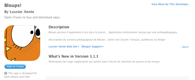 L'application coûte une 20aine de francs car il faut acheter chaque ligne à 2.- Frs. Mais c'est un bonne entraînement pour la lecture des syllables et des mots et l'interface plait bien aux enfants.