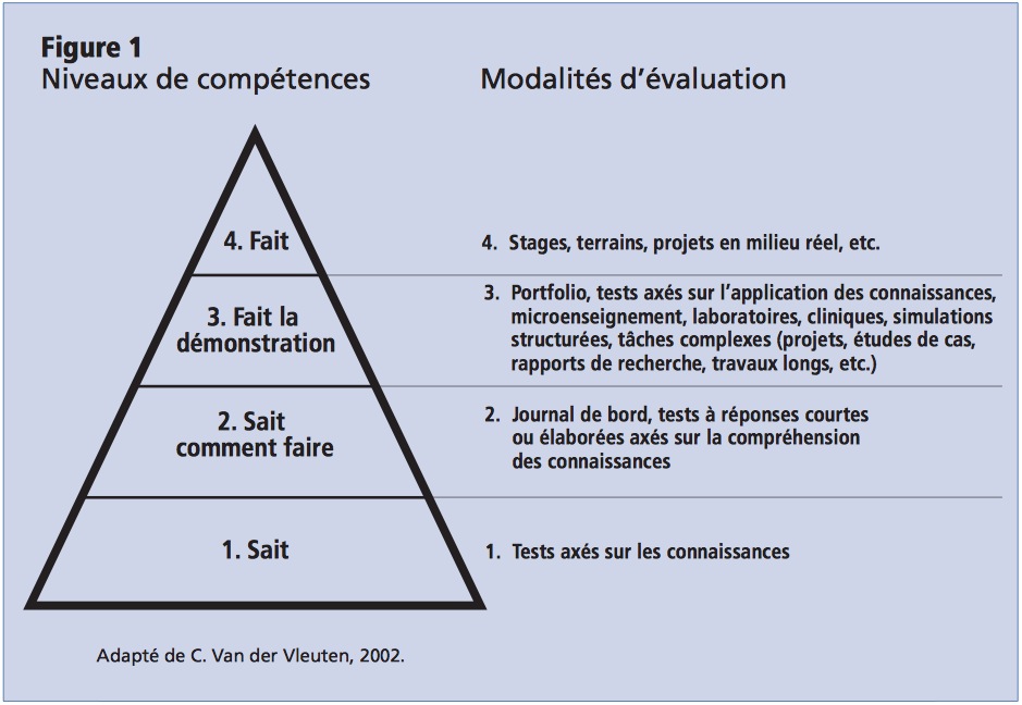 Bulletin de l'université de Montréal axé sur l'évaluation des apprentissages. On retiendra particulièrement la synthèse sous forme de pyramide des niveaux de compétences évalués (p°6, figure 1), que j'ai trouvée particulièrement parlante.