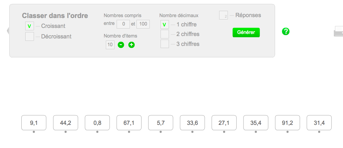 Voici une application flash à télécharger, pour travailler l’aspect ordinal des nombres. L’élève est invité à placer une série de nombres dans l’ordre croissant ou décroissant. Choisissez le type de nombres voulus, entiers ou décimaux, puis cliquez sur le bouton « Générer » et l’élève devra glisser (...)