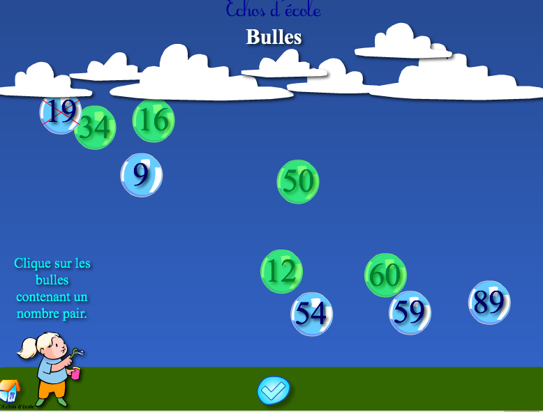 Une autre façon de travailler les nombre pairs et impairs: Petit jeu où il faut éclater les bulles en fontion du nombre qui y figure