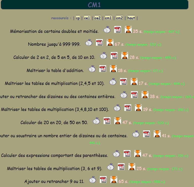 Choisis ton niveau : | cp | ce1 | ce2 | cm1 | cm2 Choisis ton objectif Entraîne-toi en ligne : Démarre l'entraînement Peut-être battras-tu le record Fabrique une fiche que tu pourras imprimer