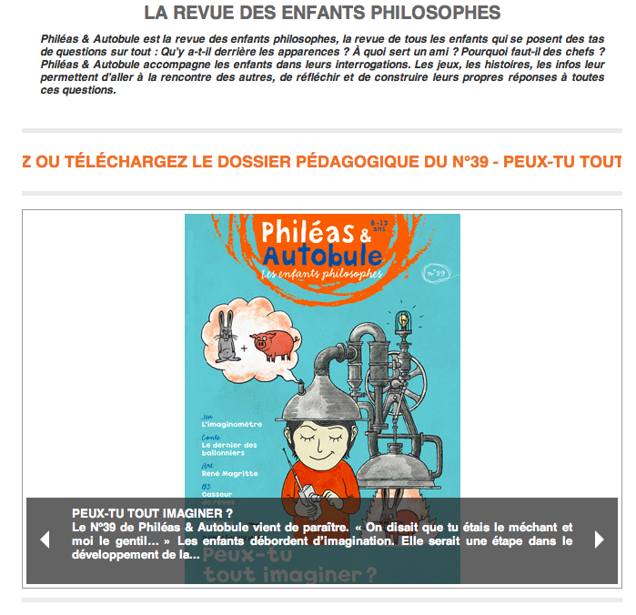 Site belge proposant une revue utilisable avec les 6-12 ans pour pratiquer des ateliers à visée philosophiques. Descriptif sur le site : "Philéas & Autobule est la revue des enfants philosophes, la revue de tous les enfants qui se posent des tas de questions sur tout : Qu’y a-t-il derrière les (...)