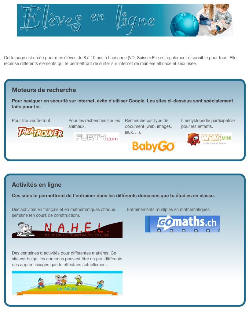 Ce lien est une proposition de page d'accueil pour vos élèves, en particulier au cycle 2. Elle contient des moteurs de recherche sécures et quelques sites d'entraînement pédagogique.