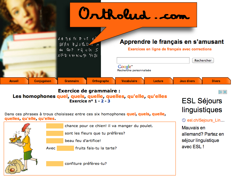 Ce logiciel didactique (www.ortholud.com) permet aux élèves d’accomplir des exercices en français, comme la conjugaison, la grammaire, l’orthographe, le vocabulaire et la lecture. Le lien ci-dessous renvoie à trois exercices sur les homophones quel-le-s et qu’elle-s. Le déroulement s’ensuit de cette (...)