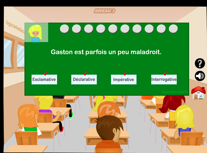 Logiciel éducatif portant sur les types de phrases (interrogatives, déclaratives, impératives et exclamatives).