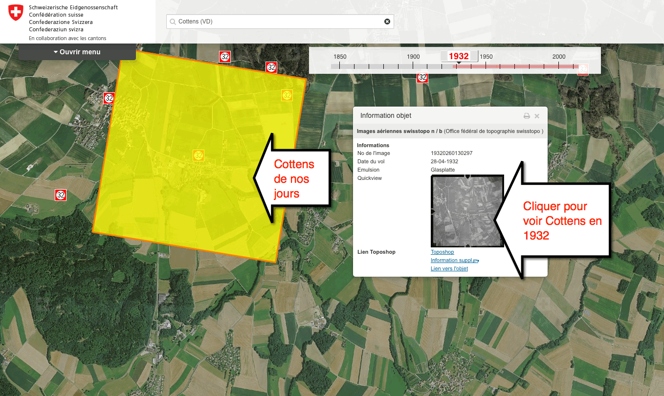 320'000 photos aériennes de la Suisse de 1920 à nos jours. Découvrez à quoi ressemblait votre ville ou votre village avant votre naissance! L'interface pouvant paraître un peu déconcertante, voici un petit mode d'emploi: faites une recherche sur le nom de votre ville ou village déplacez le curseur (...)