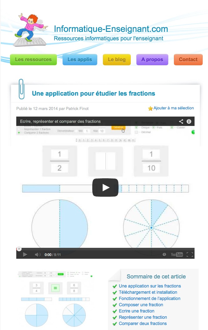 Ce logiciel permet de travailler de nombreuses notions en mathématiques (addition, caclul mental, mesure, tangram, ...) et propose des petites vidéos récapitulatives pour certaines activités. Le site propose également différents niveaux de difficulté et peut donc être utilisé avec des élèves de tout (...)