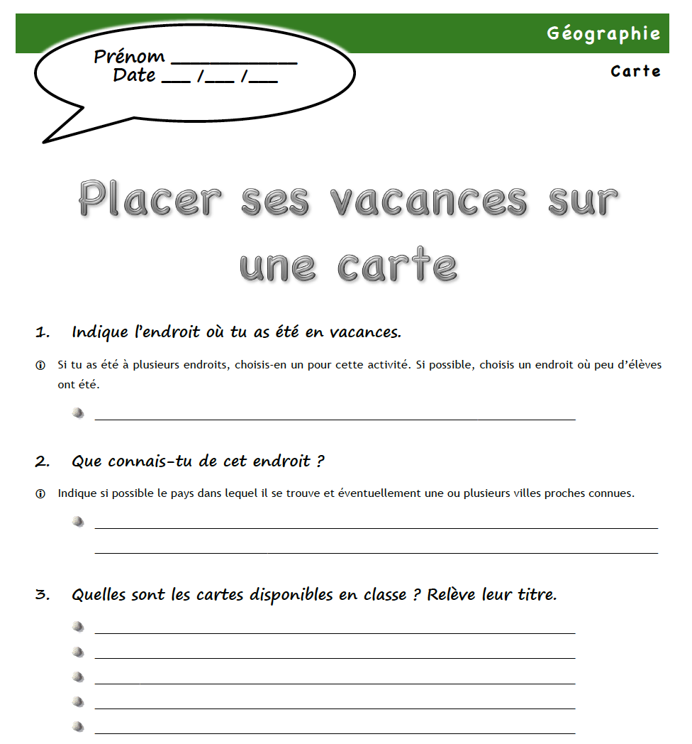 Une première introduction à la notion de carte : choisir la carte la plus pertinente parmi celles présentes en classe pour indiquer son lieu de vacances.