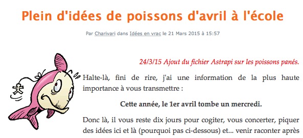 Qu'est-ce qu'un bon Poisson d'Avril à l'école ? Ah ah, en voilà une bonne question... Une bonne blague qui fera rire les profs, qui fera rire les élèves après coup, mais "pas jaune". (Je suis mal à l'aise avec les blagues trop stressantes, où, par exemple, les élèves pensent pendant une journée (...)