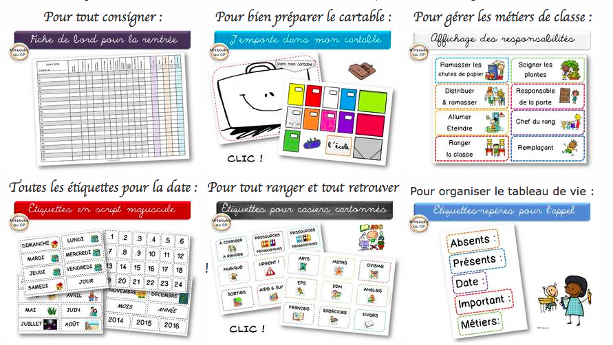 Beaucoup d'idées pour préparer la rentrée scolaire: Fiches de bord Etiquettes Pages de garde Dossiers divers Aides pour les rangements et les ateliers etc
