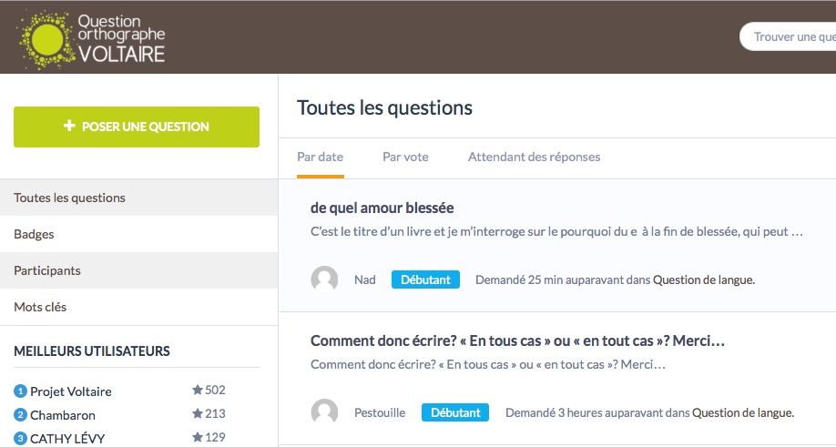 Service en ligne collaboratif, gratuit et sans publicité. Vous avez une question d’orthographe, grammaire, syntaxe, ponctuation ? Posez-la sur question-orthographe.fr. La réponse ne tardera pas. Des passionnés et des experts de la langue française se plient en quatre pour vous.