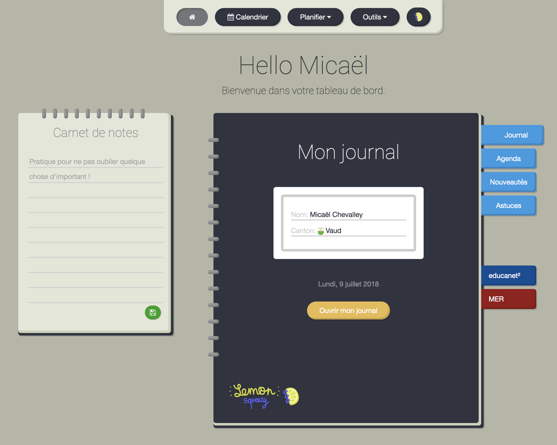 Outil en ligne pour créer son agenda scolaire ou cahier de préparation en ligne. Parmi les différentes fonctions, vous trouvez : un calendrier, pour vos différents événements un bloc-notes, pour tout ce qu'il ne faut pas oublier des outils de planifications hebdomadaire Cet outil déjà utilisable est (...)
