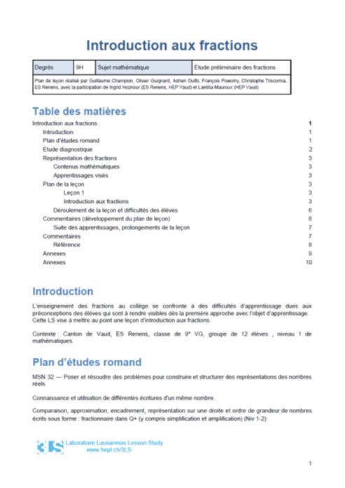 Degré : 9H Discipline : Mathématiques Mots clés : Fractions, représentation, partie d'un tout Date : 2019 Vous pouvez retrouver l'ensemble des plans de leçons du Laboratoire Lausannois Lesson Study (3LS) sur le site web suivant: Laboratoire Lausannois Lesson Study (3LS).