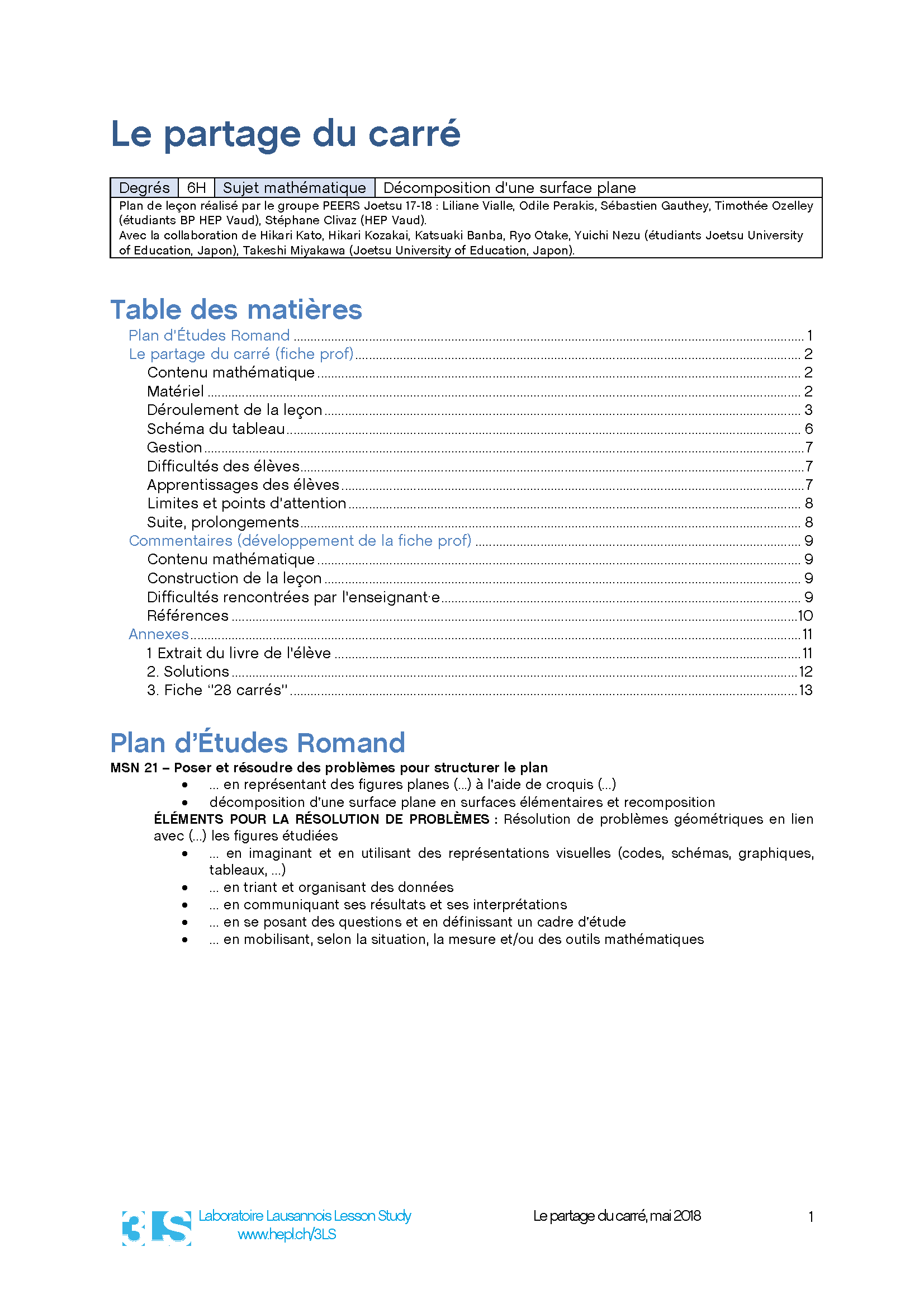 Degré : 6H Discipline : Mathématiques Mots clés : Décomposition de surface, carré, validation Date : Mai 2018 Vous pouvez retrouver l'ensemble des plans de leçons du Laboratoire Lausannois Lesson Study (3LS) sur le site web suivant: Laboratoire Lausannois Lesson Study (3LS).
