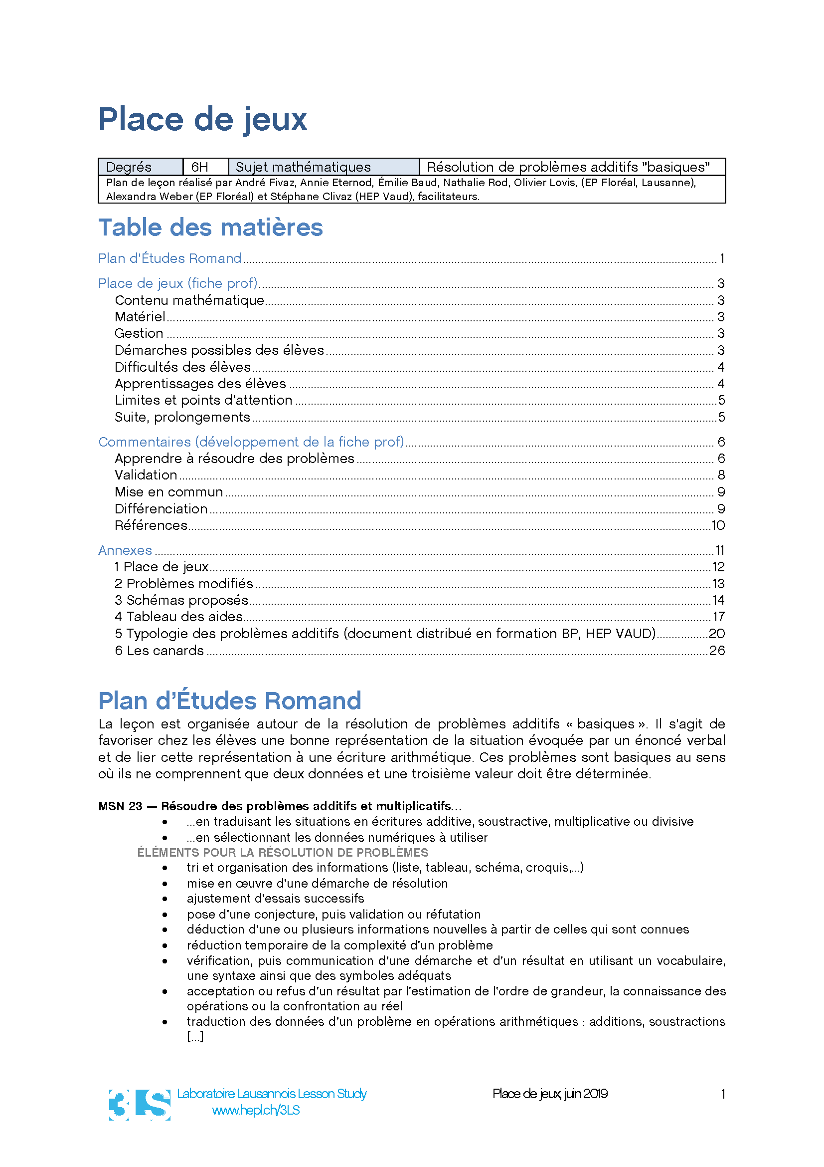Degré : 6H Discipline : Mathématiques Mots clés : Problèmes, addition, représentation schématique Date : Juin 2019 Vous pouvez retrouver l'ensemble des plans de leçons du Laboratoire Lausannois Lesson Study (3LS) sur le site web suivant: Laboratoire Lausannois Lesson Study (3LS).