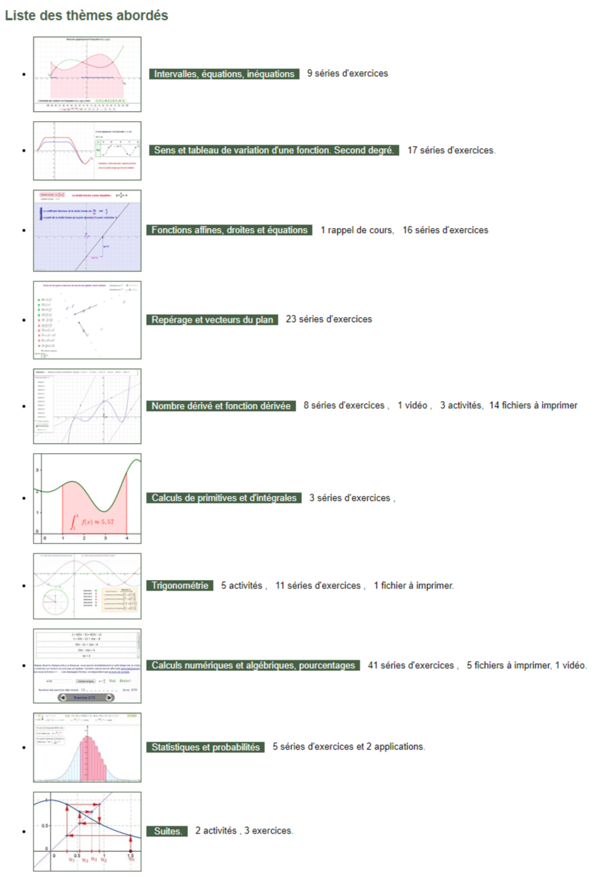 Ce site contient plus d'une centaines d'exercices interactifs : Liste des thèmes abordés Intervalles, équations, inéquations 9 séries d'exercices Sens et tableau de variation d'une fonction. Second degré. 17 séries d'exercices. Fonctions affines, droites et équations 1 rappel de cours, 16 séries d (...)