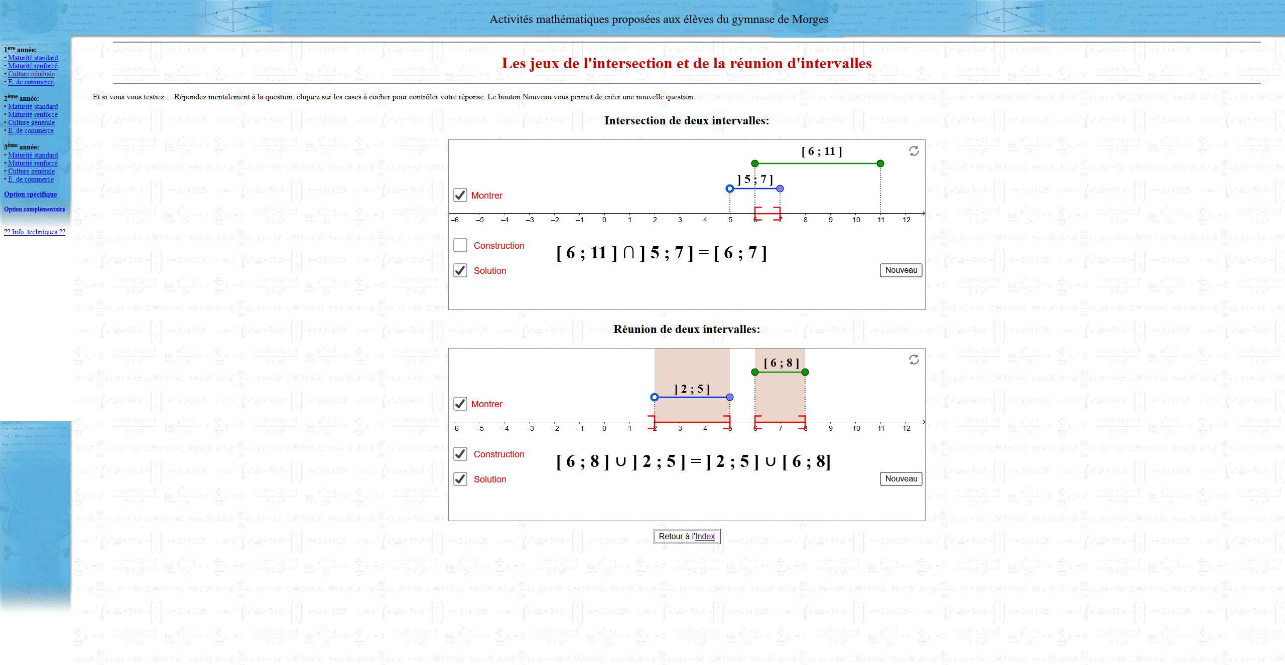 Comment déterminer l'intersection ou la réunion de deux intervalles ? Jean-Philippe Javet propose ici d'utiliser Geogebra afin d'expliquer visuellement la différence entre l'intersection et la réunion de deux intervalles. L'outil génère automatiquement différents cas de figures.