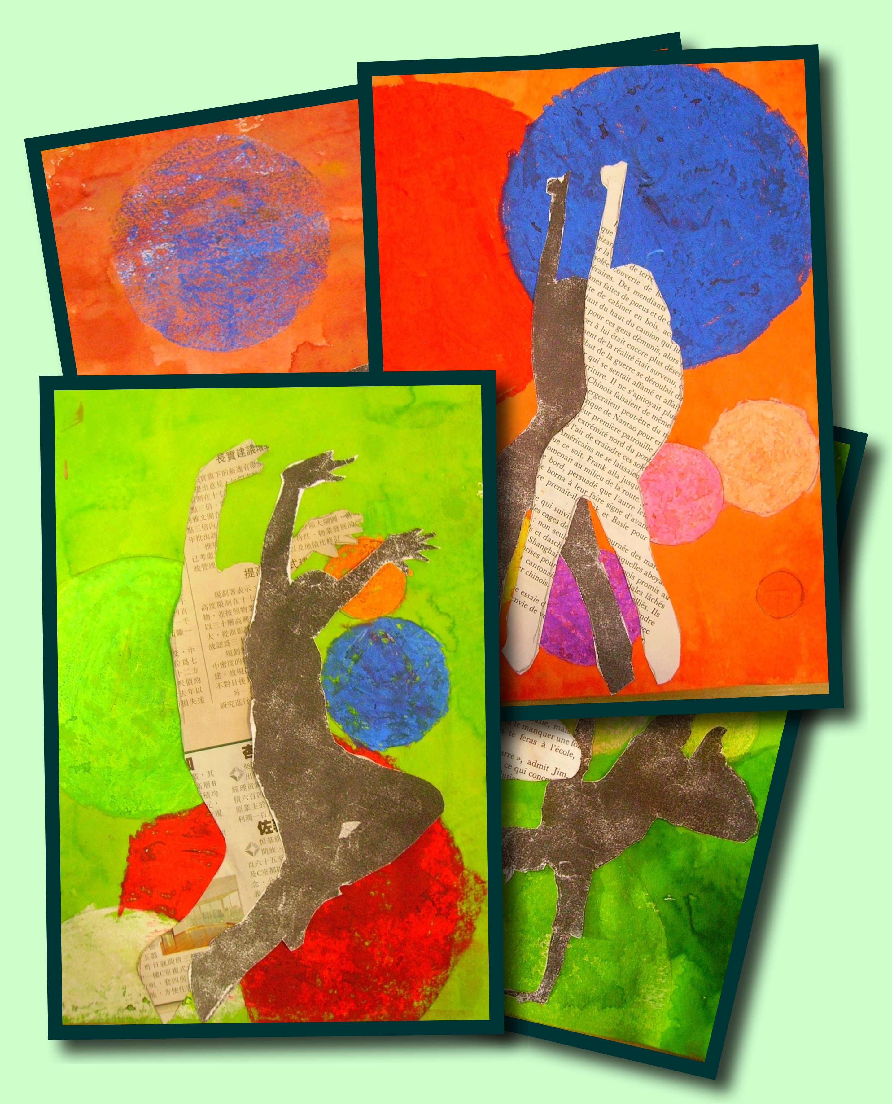 "Silhouettes noires de danseurs trouvées sur internet, L’idéal serait de photographier les élèves en train de danser et de se servir de leur propre silhouette pour cette réalisation."