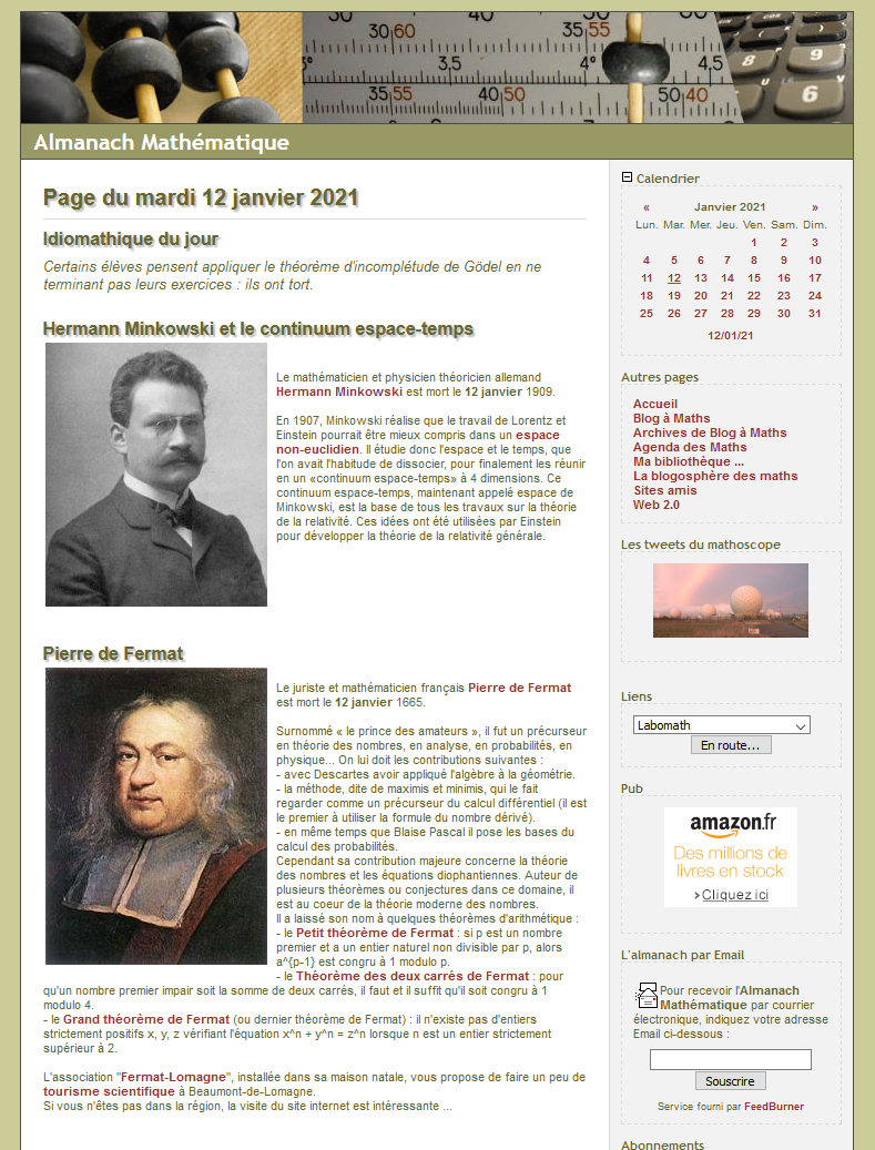 Ce site est l'aboutissement d'un travail remarquable de Bernard Ycart. Il contient 228 histoires sur les notions mathématiques enseignées au college, lycée, et à l’université. Vous pouvez retrouver une interview de Bernard Ycart sur le site MathémaTice.