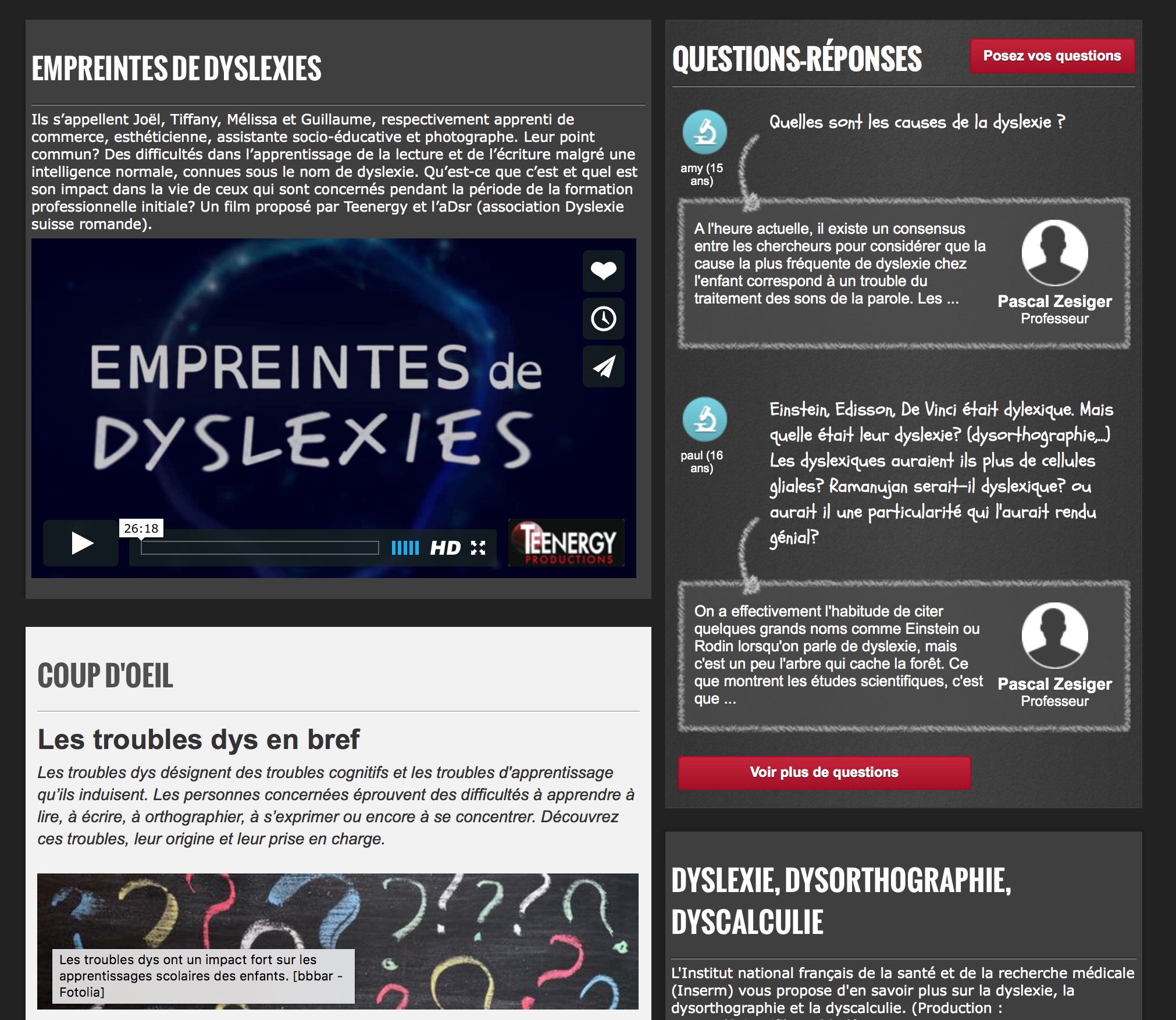 Les troubles dys touchent environ un enfant sur 10 en Suisse. Ils regroupent un ensemble de troubles: dyslexie, dyscalculie, dysorthographie, dyspraxie, dysphasie, etc., selon le domaine touché (écriture, calcul, orthographe, motricité, parole). Dans ce dossier, découvrez ces différents troubles (...)
