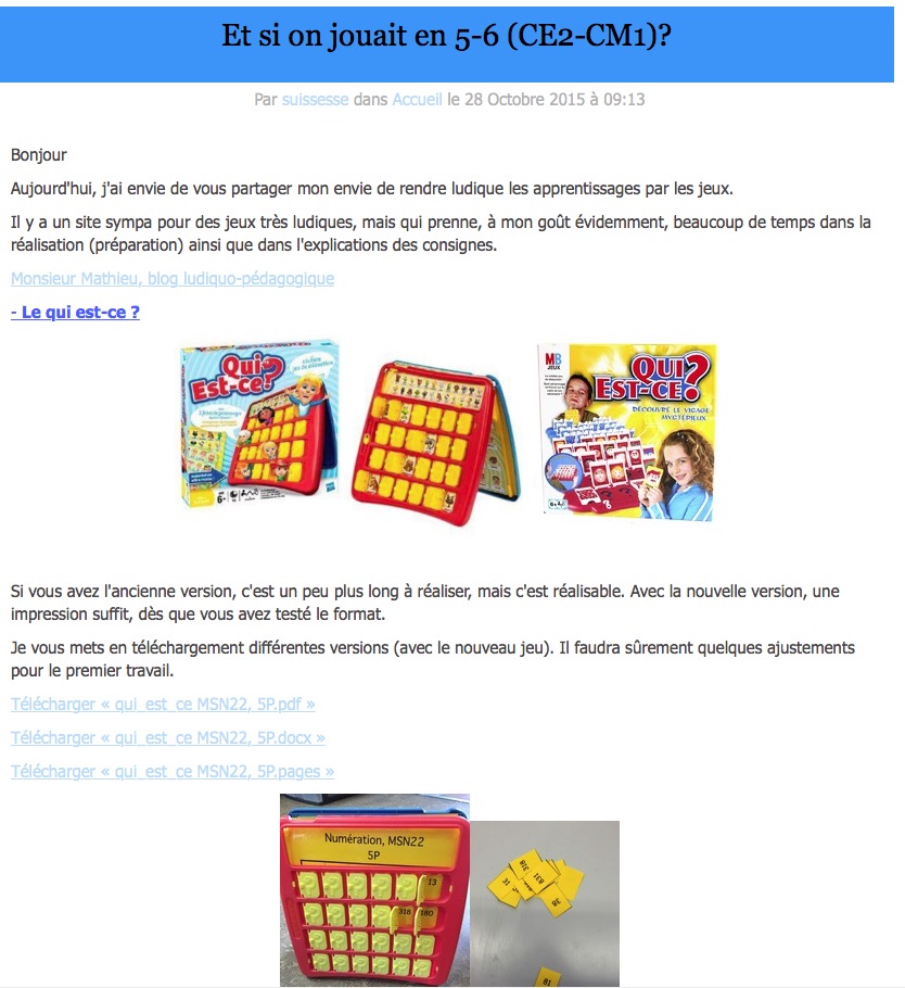 Un blog tout neuf, septembre 2015 qui présente le travaille d'une enseignante romande. Liens, idées, applications pour aider les enseignants, propositions d'organisation d'ateliers, moyen de relecture en production d'écrit, gestion de classe, pistes pour les Mitics, propositions en art visuel font (...)