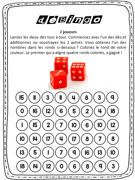 Il s'agit de lancer les dés et de combiner les résultats de façon à obtenir les nombres inscrits sur la fiche de jeu. On colorie alors le rond contenant ce nombre. La partie se termine quand on a aligné 4 ronds coloriés à l'horizontale, à la verticale ou en diagonale. 6 fiches de jeux portant sur l (...)
