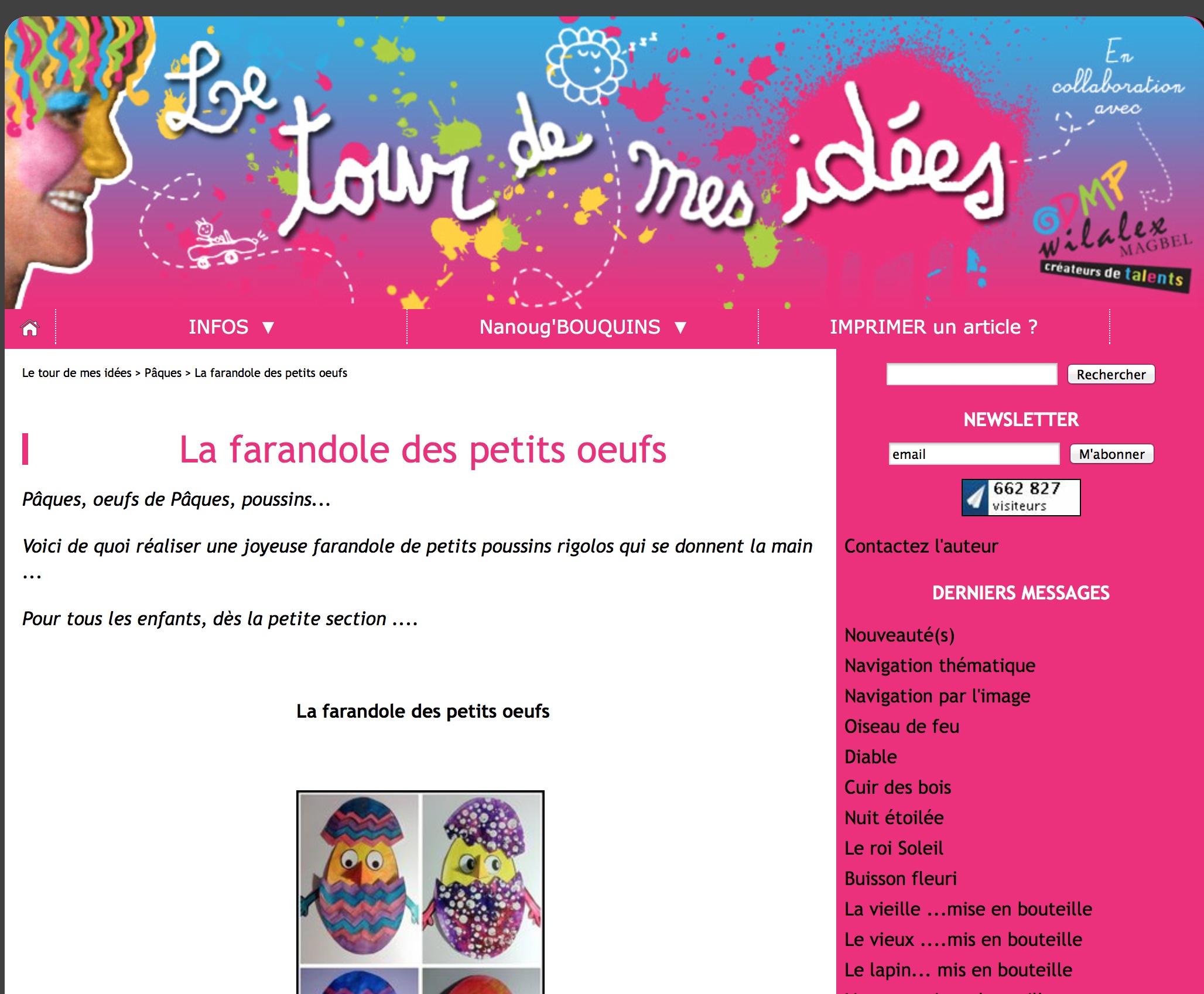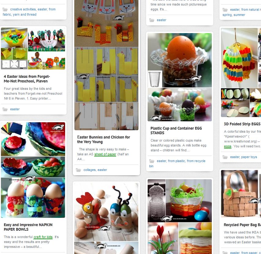 Que de superbes idées ! .......Originales, variées et simples. (3 pages sur le thème de "Pâques") Pas besoin de traduction, les images parlent d'elles-mêmes. Prenez le temps de fouiller ce site bulgare.... Il y en a pour tous les goûts !! J'ai souvent exécuté des bricolages tirés de cet univers (...)