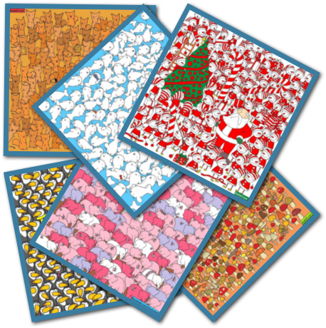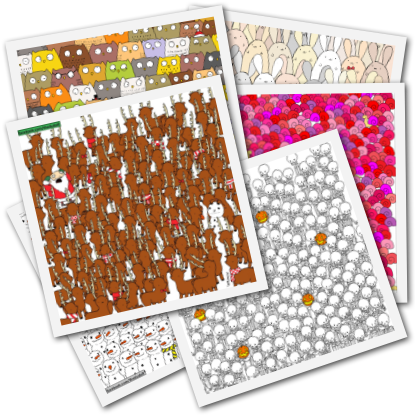 Des dessins dans lesquels il met au défi les internautes de retrouver un personnage caché. 10 images différentes.... Enregistrer l'image dans votre ordi ou copier coller sur une " page blanche".