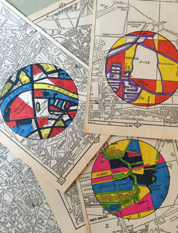 ... J'ai déchiré quelques pages des années 70 jaunies de mon père, AZ de Londres avec l'idée de gribouiller sur des cartes. Encore une fois, dessiner autour d'un rouleau de ruban adhésif avec un stylo puis colorier dans le cercle. Intéressant et original. Utiliser différents "fonds de pages"....puis (...)