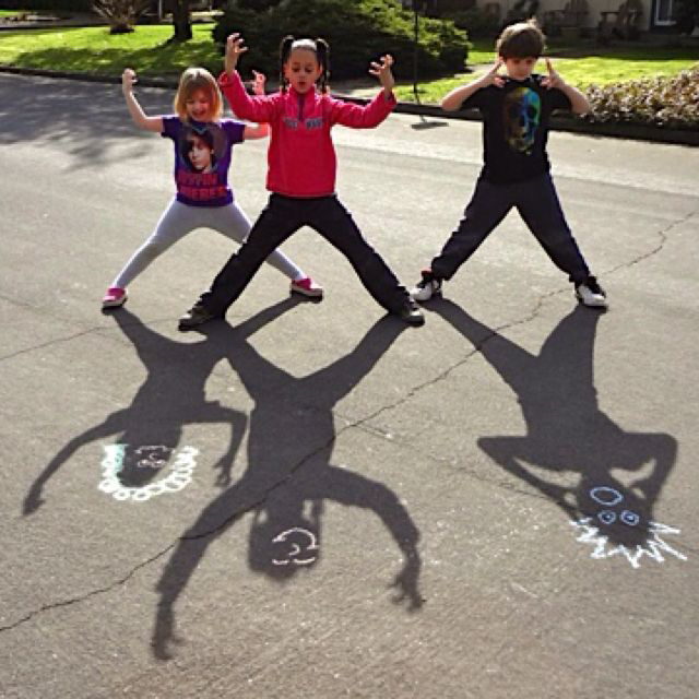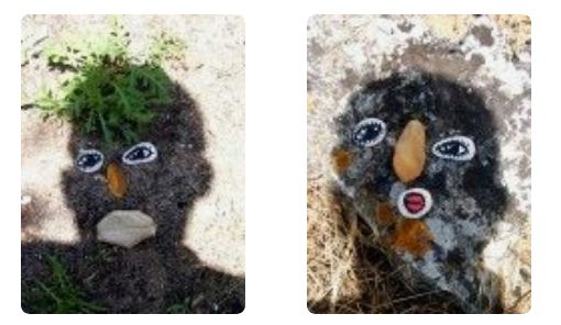 Par un jour ensoleillé : utilisation des ombres. Décorer les ombres, rendre "vivantes" les ombres. Matériel : craies ou objets ou ce que j'ai trouvé dans la nature. Portraits éphémères... penser à immortaliser les chefs-d'oeuvres !